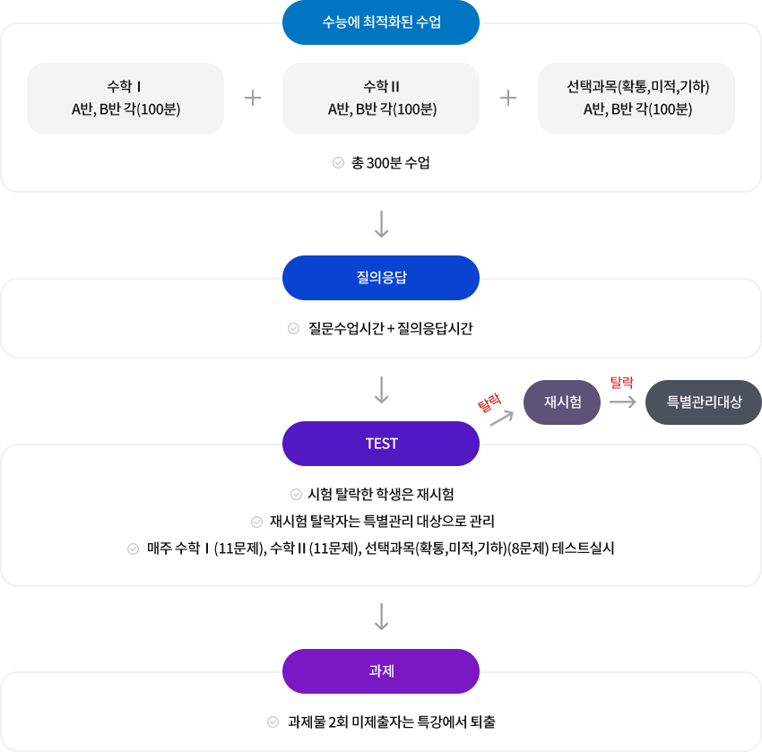 - B반 : 5,6등급 학생(정원25명) 수학Ⅰ반, 수학Ⅱ반, 확률과통계반, 미적분반, 기하반
