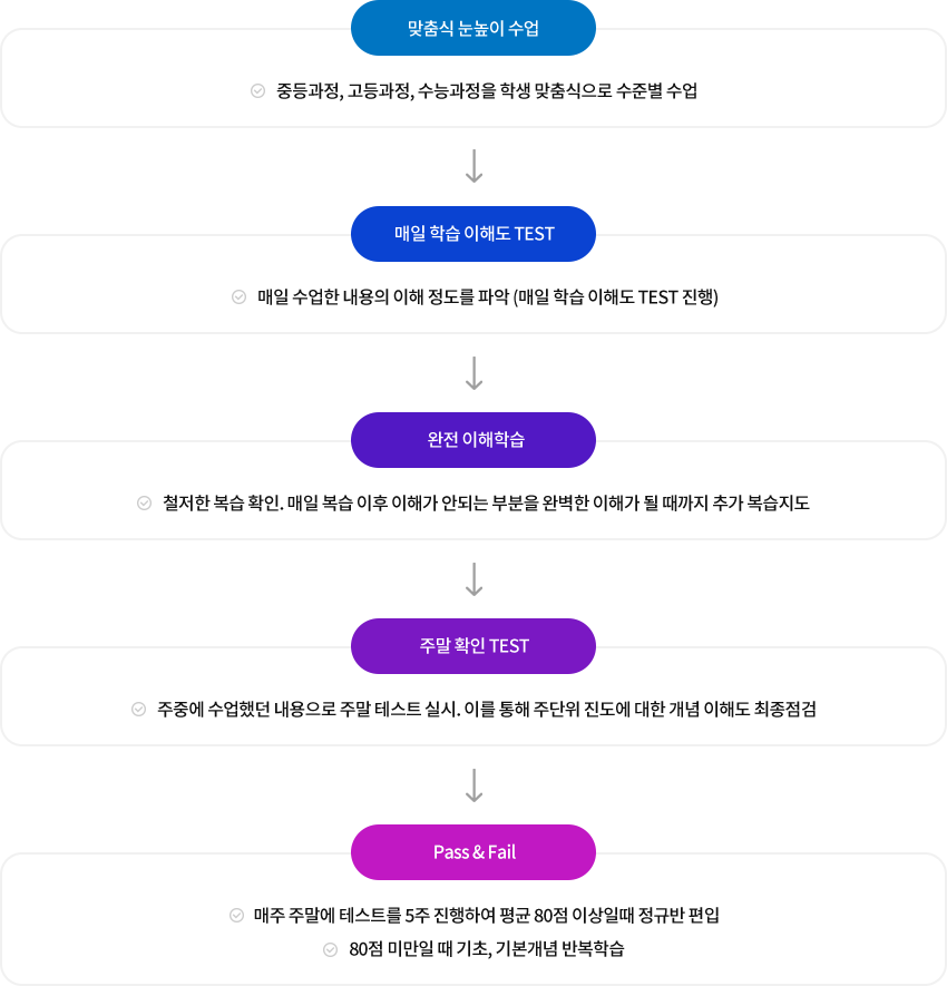 - 기초 다지기 수업과 개념 이해도 테스트를 통해 이해가 부족한 학생들을 추가 복습지도